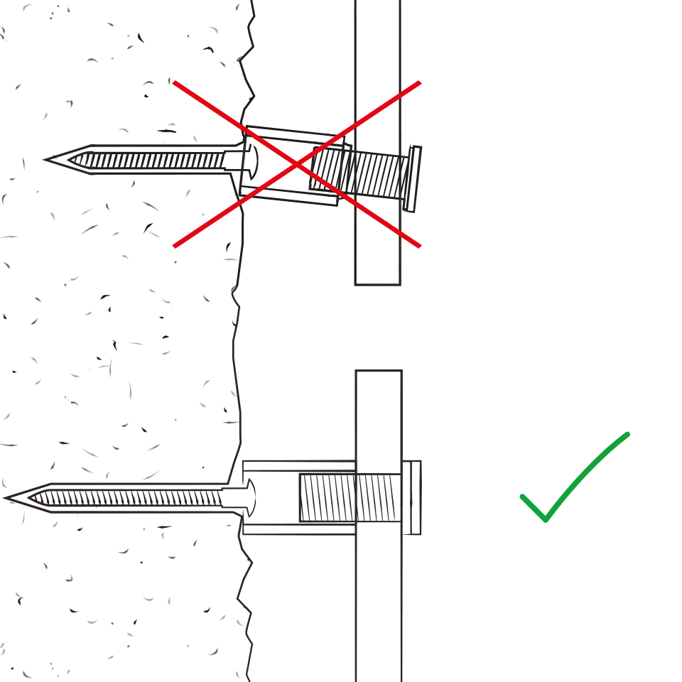 Vrtání otvorů se ne vždy podaří přesně tam, kde je naplánováno. U dvoudílných systémů je nutné distanční prvky nejprve přišroubovat ke stěně a poté je umístit přesně do místa vyvrtaného otvoru. Pokud je vrtací otvor příliš daleko od plánovaného bodu, značka se na distanční podložky již nevejde.