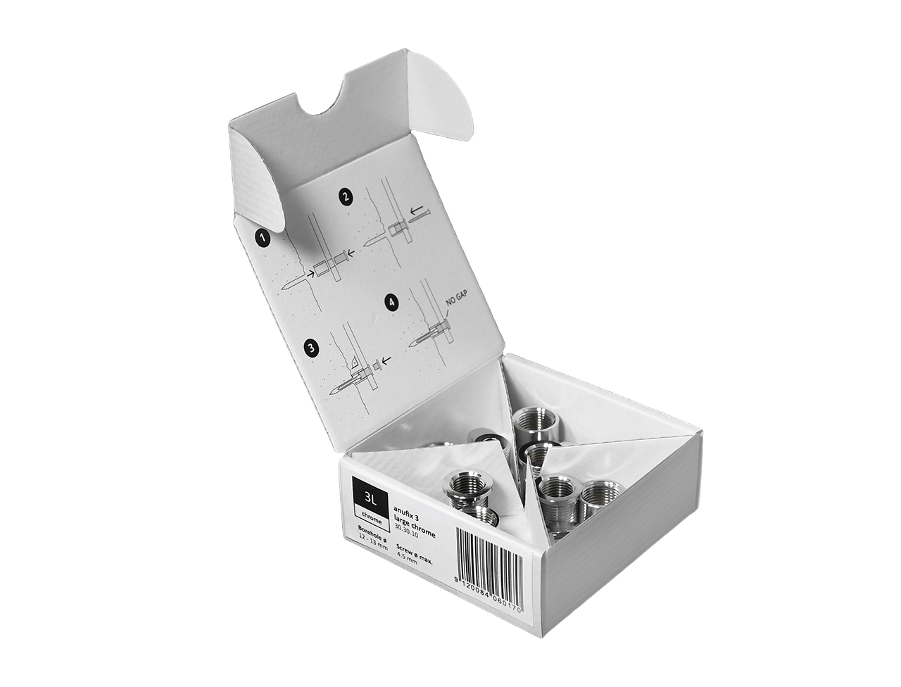 Kryty šroubů u upevnění anufix 3 jsou ještě plošší než u anufix 2, ale protože se anufix 3 skládá také ze 3 kusů, je montáž naprosto totožná.